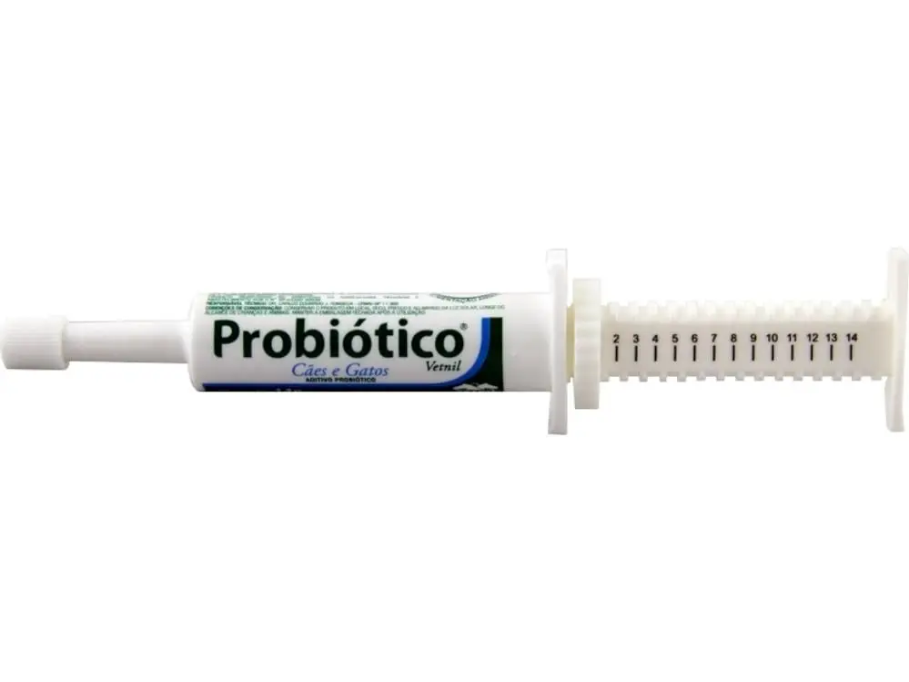 Suplemento probiótico em pasta (seringa de 14 g), destinado a regular a microbiota intestinal de cães e gatos, com 4 cepas de bactérias e 1 de levedura para promover digestão, absorção de nutrientes e reforço imunológico